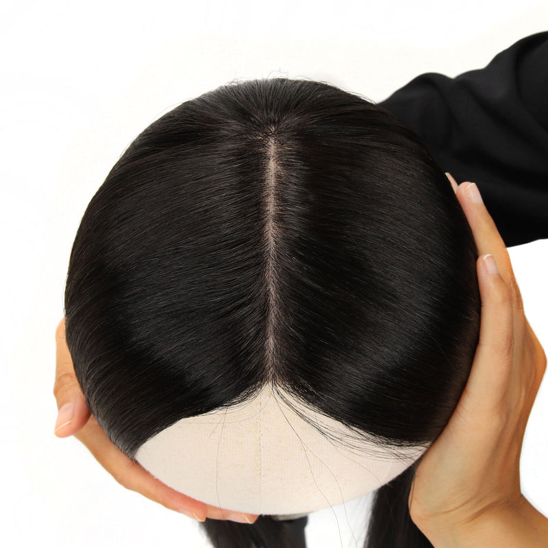 Nuestro topper de seda para el cabello presenta un diseño en la parte superior que brinda la parte del cabello de aspecto más natural, lo que lo distingue de otras opciones. La característica destacada de nuestro topper de seda para el cabello es su capacidad de ofrecer una apariencia impecable, lo que le permite usarlo con confianza. No tendrá que preocuparse de que las personas noten que está usando un topper o vean los nudos.