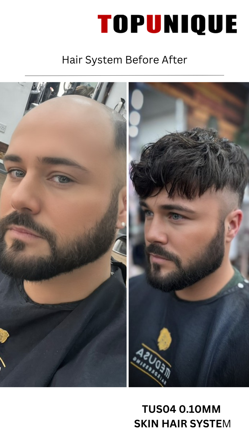 TUS04 Postizos para hombres | 0,10 mm de piel con cabello completo | Los más duraderos entre los sistemas de cabello de piel